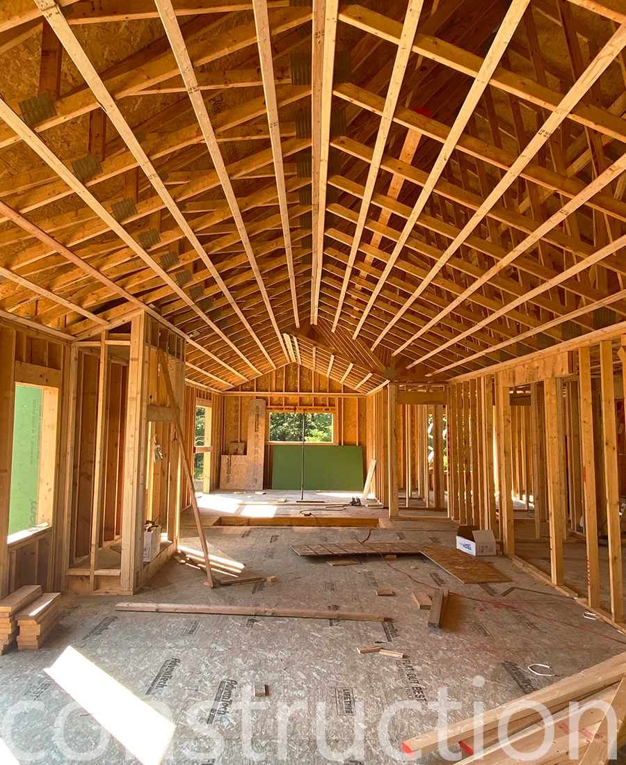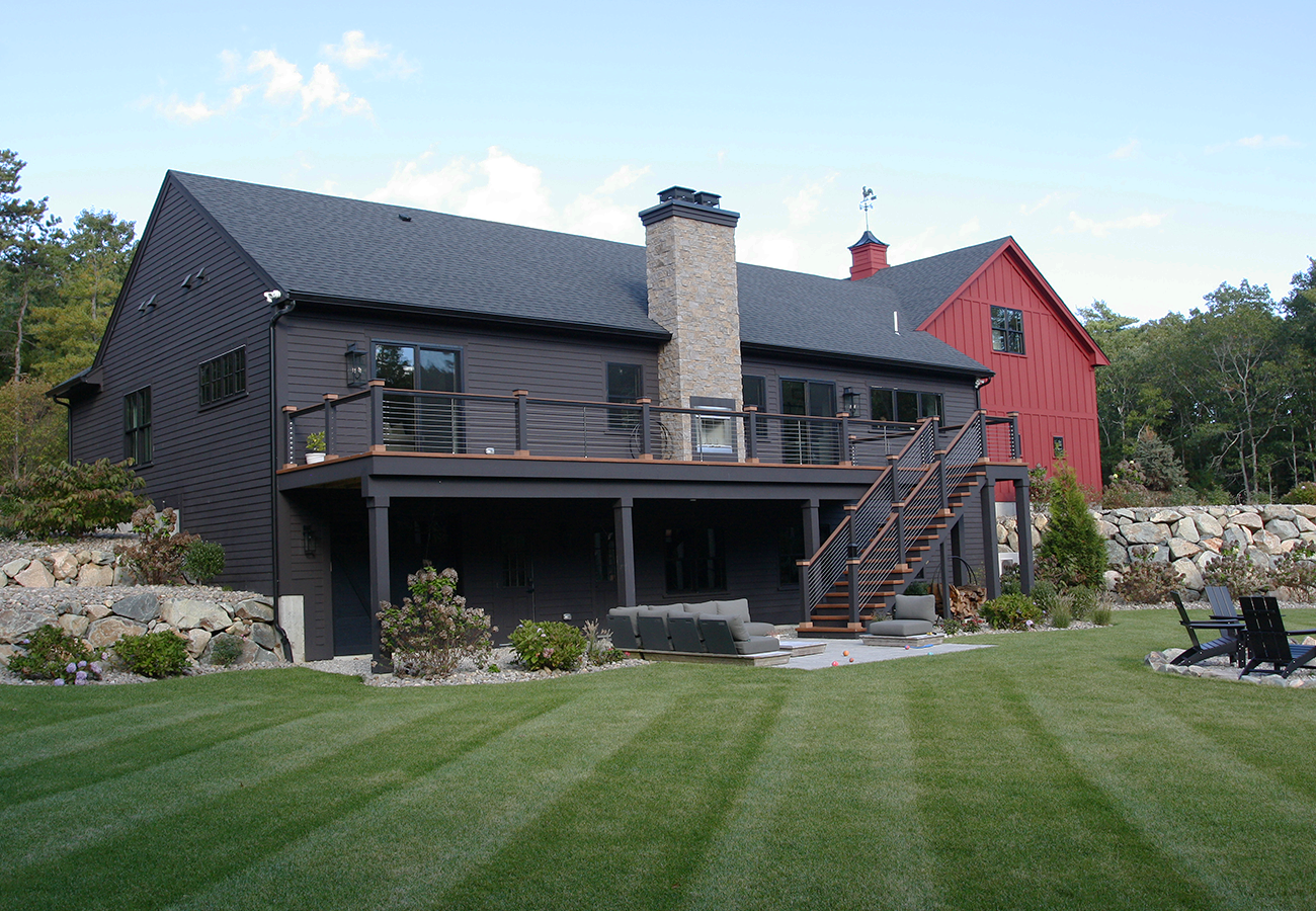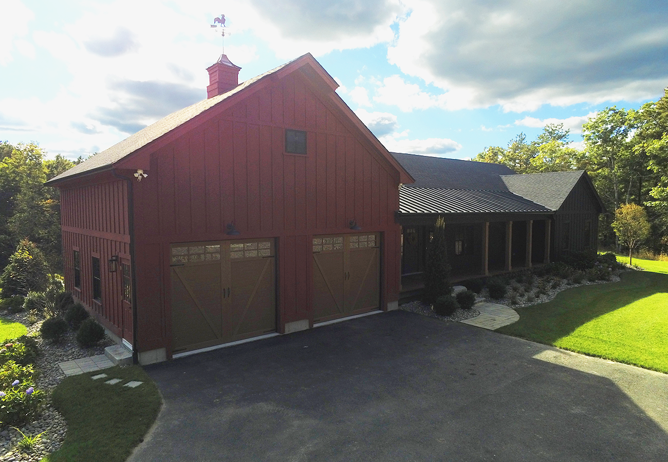New trussed-roof farmhouse house with some modern flare.
