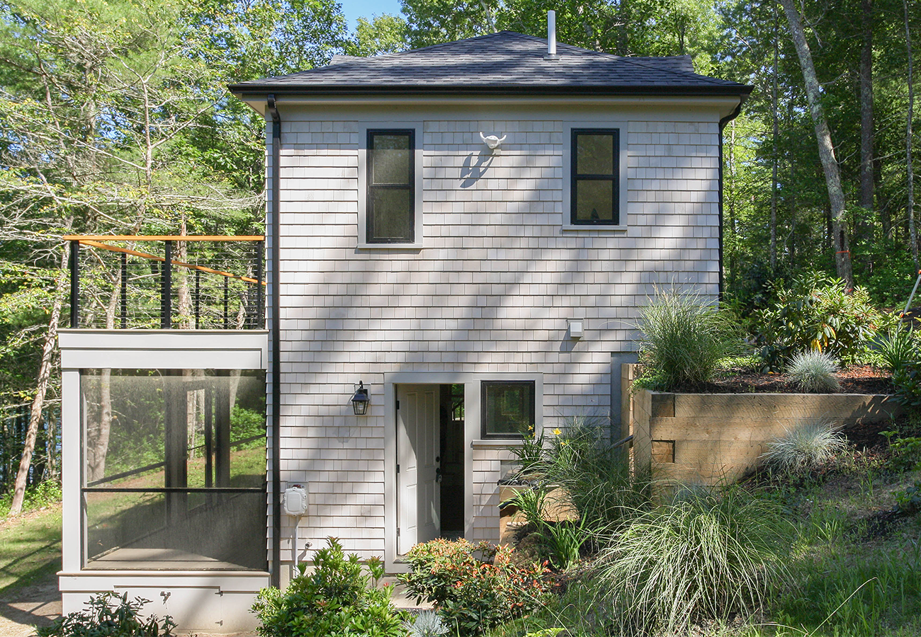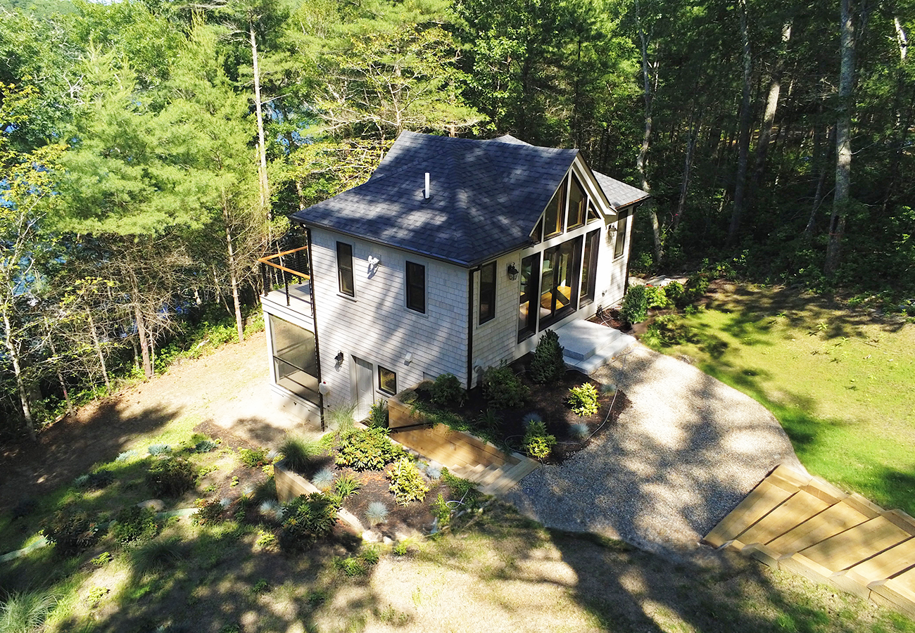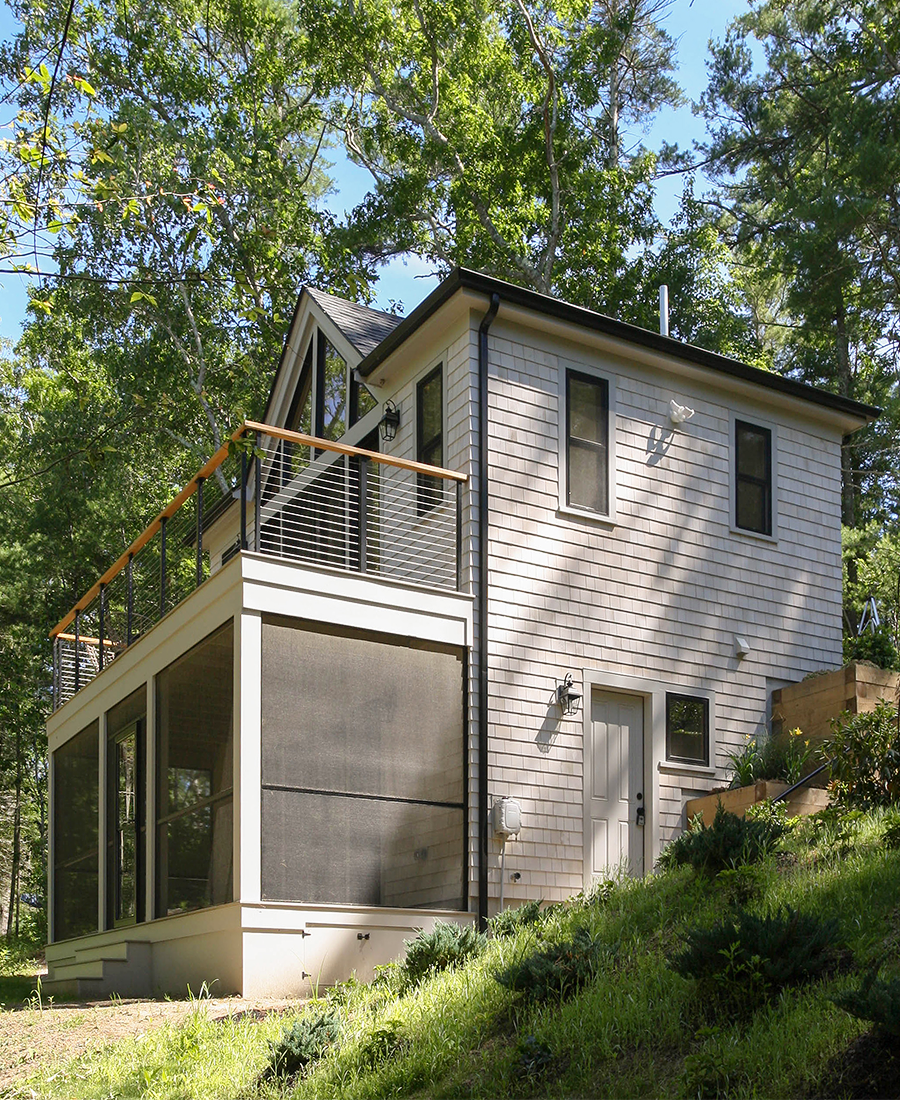 a lower level area for winter boat storage and an upper level sitting space to enjoy the view of the pond.