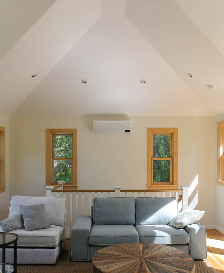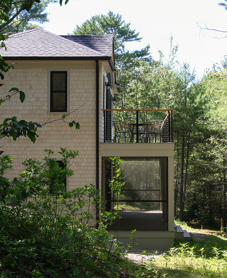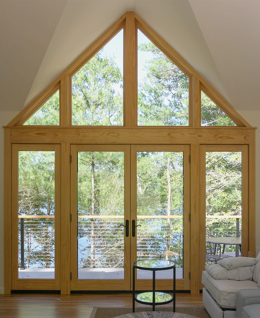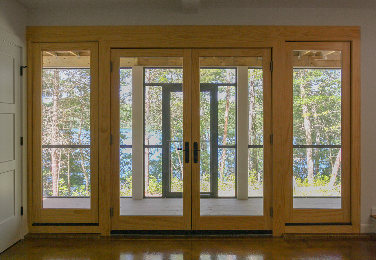 a lower level area for winter boat storage and an upper level sitting space to enjoy the view of the pond.
