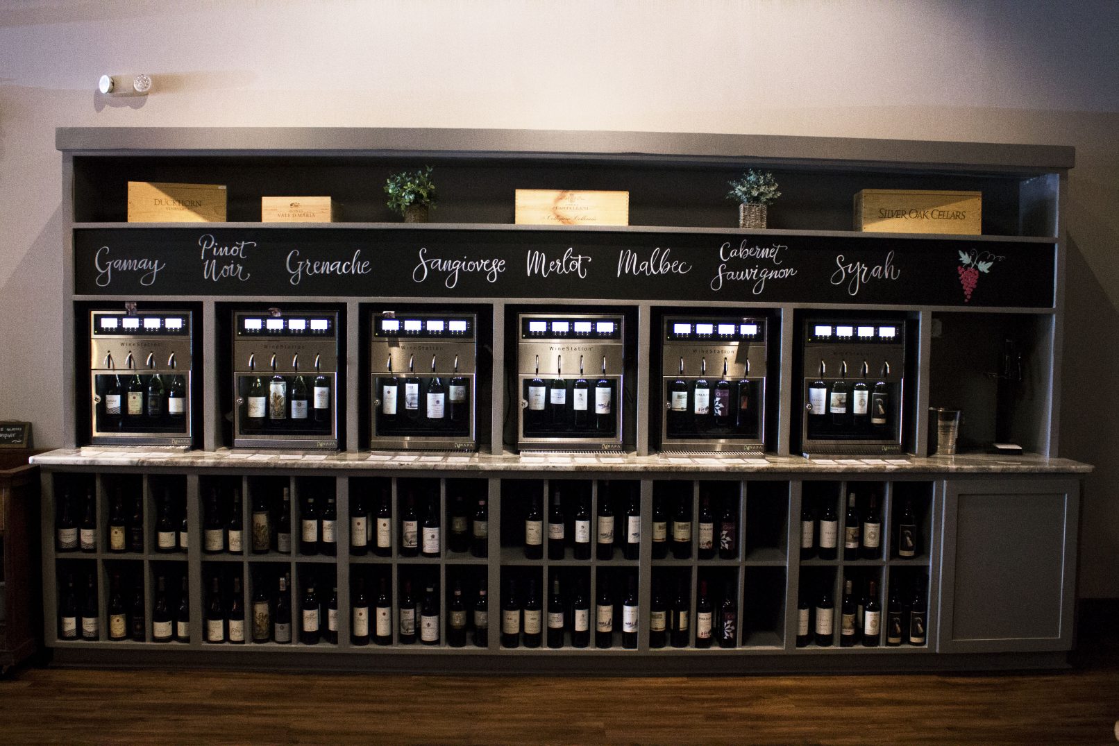 Our team worked closely with the tenant to develop the interior details of their space within a building we had previously worked on. We worked with the layout to choreograph the flow through the space to meet their needs, envisioned the use of different materials and textures, as well as designed custom cabinetry for their signature wine stations.